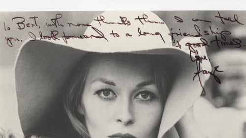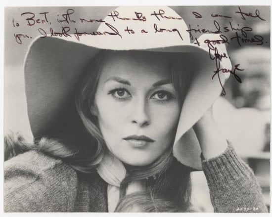 Description: Stunning inscribed and signed (first name) portrait taken for Puzzle of a Downfall Child (1970), a film that has gained critical esteem over the years. An extremely rare early item signed to a crew member. Dunaway, one of the great beauties of film history, is a key figure of the New Hollywood era for having given legendary performances in Bonnie and Clyde (1967), Chinatown (1974), and Network (1976), for which she won an Oscar. Her other renowned films include The Thomas Crown Affair (1968), The Three Musketeers (1973), The Four Musketeers (1974), The Towering Inferno (1974), Three Days of the Condor (1975), and Mommie Dearest (1980). (Vintage original photograph; true vintage autograph)