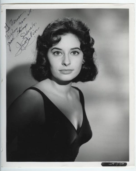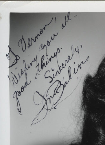 Description: Exceptionally rare portrait circa late fifties or early sixties, inscribed and signed. Balin appeared in several movies and made guest appearances on top TV shows of the network era. Credits include The Black Orchid (1958), From the Terrace (1960), The Comancheros (1961), The Patsy (1964), and Charro (1969; starring Elvis Presley), and episodes of Bonanza, Get Smart, Mannix, Barnaby Jones, Battlestar Galactica, and more. The beautiful actress succumbed to illness at only fifty-two in 1990. (Vintage original photograph; true vintage autograph)