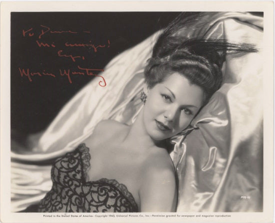 Description: Extremely rare 1942 publicity portrait inscribed and signed by the beautiful Dominican-born actress. Montez starred in the 1944 Technicolor adventure Cobra Woman, long regarded as the definitive camp classic. Other films include Arabian Nights (1942), Ali Baba and the Forty Thieves (1944), Gypsy Wildcat (1944), and Siren of Atlantis (1949). Her untimely death at age thirty-nine occurred in 1951. (Vintage original photograph; true vintage autograph)